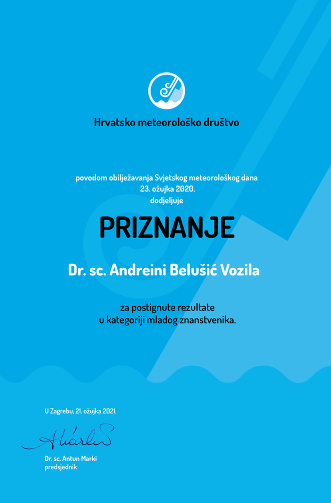 Dr. sc. Andreina Belušić Vozila, rođena je 4. ožujka 1991. g. u Rijeci. Doktorirala je 2018. godine pri Geofizičkom odsjeku Prirodoslovno-matematičkog fakulteta Sveučilišta u Zagrebu s temom “Obilježja vjetra u sadašnjoj i budućoj klimi na temelju simulacija regionalnih klimatskih modela” pod vodstvom izv. prof. dr. sc. Maje Telišman Prtenjak i dr. sc. Ivana Güttlera.